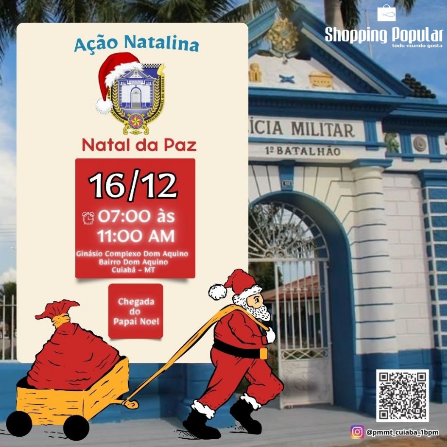 A Policia Militar de Mato Grosso através do 1º Batalhão em parceria com o Shopping Popular realizará no próximo sábado (16) uma manhã recreativa para as crianças da região com a tão esperada chegada do Papai Noel. O evento acontecerá no Complexo Poliesportivo Manoel José de Arruda (Ginásio Dom Aquino).