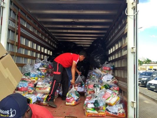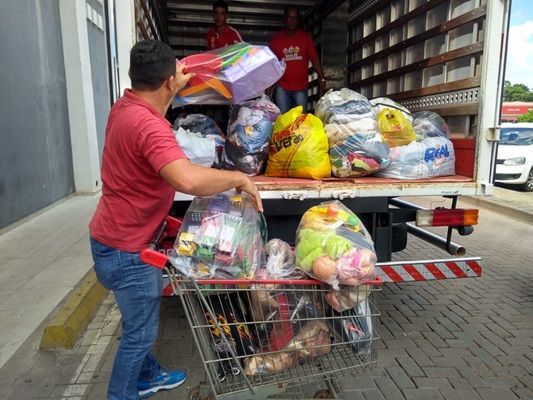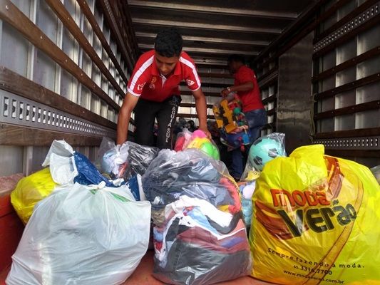 As contribuições arrecadadas no Shopping Popular se fez necessário a presença de um caminhão para o transporte dos donativos. Portanto, colaboradores e amigos se mobilizam para o carregamento do veículo.