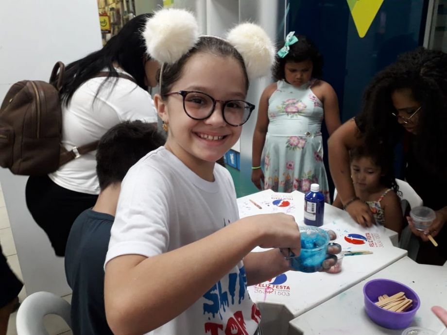 Diversão contemplada pela pequena Roberta Cristina, que colocou a “mão na massa” durante a primeira edição da oficina no Shopping Popular. “Minha filha e sobrinha adoram fazer slime. Entretém bastante. Já comprei cola para elas fazerem em casa duas ou três vezes”, conta o pai da menina, o técnico de informática Elevaldo de Souza.