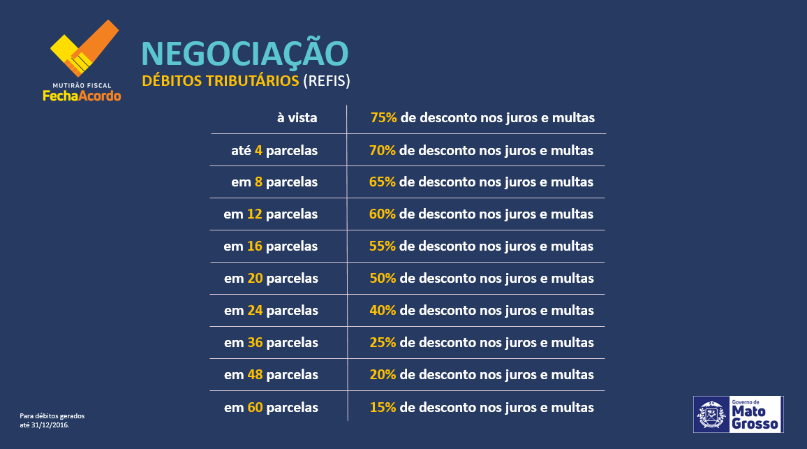 Nesses casos, os interessados podem promover a quitação dos débitos por meio do site http://mutiraofiscal.mt.gov.br/.