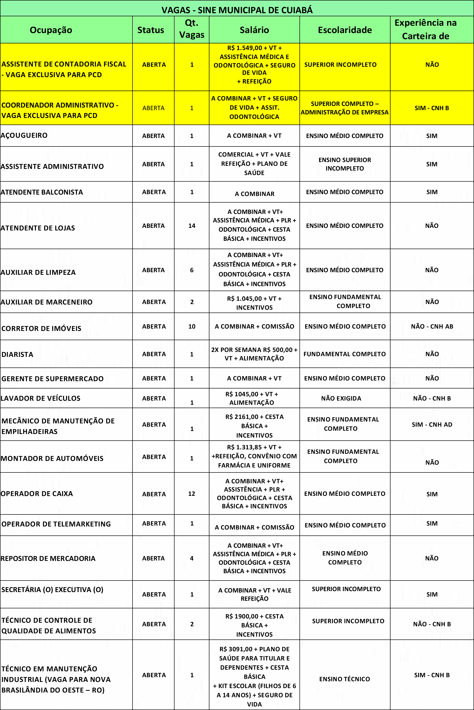 Com uma de suas sedes no Shopping Popular, o Sistema Nacional de Emprego (Sine-MT), oferece mais de 60 vagas de emprego nesta quarta-feira (24). Entre elas, há vagas para corretor de imóveis, atendente de loja, gerente de supermercado, vigia noturno, entre outras.