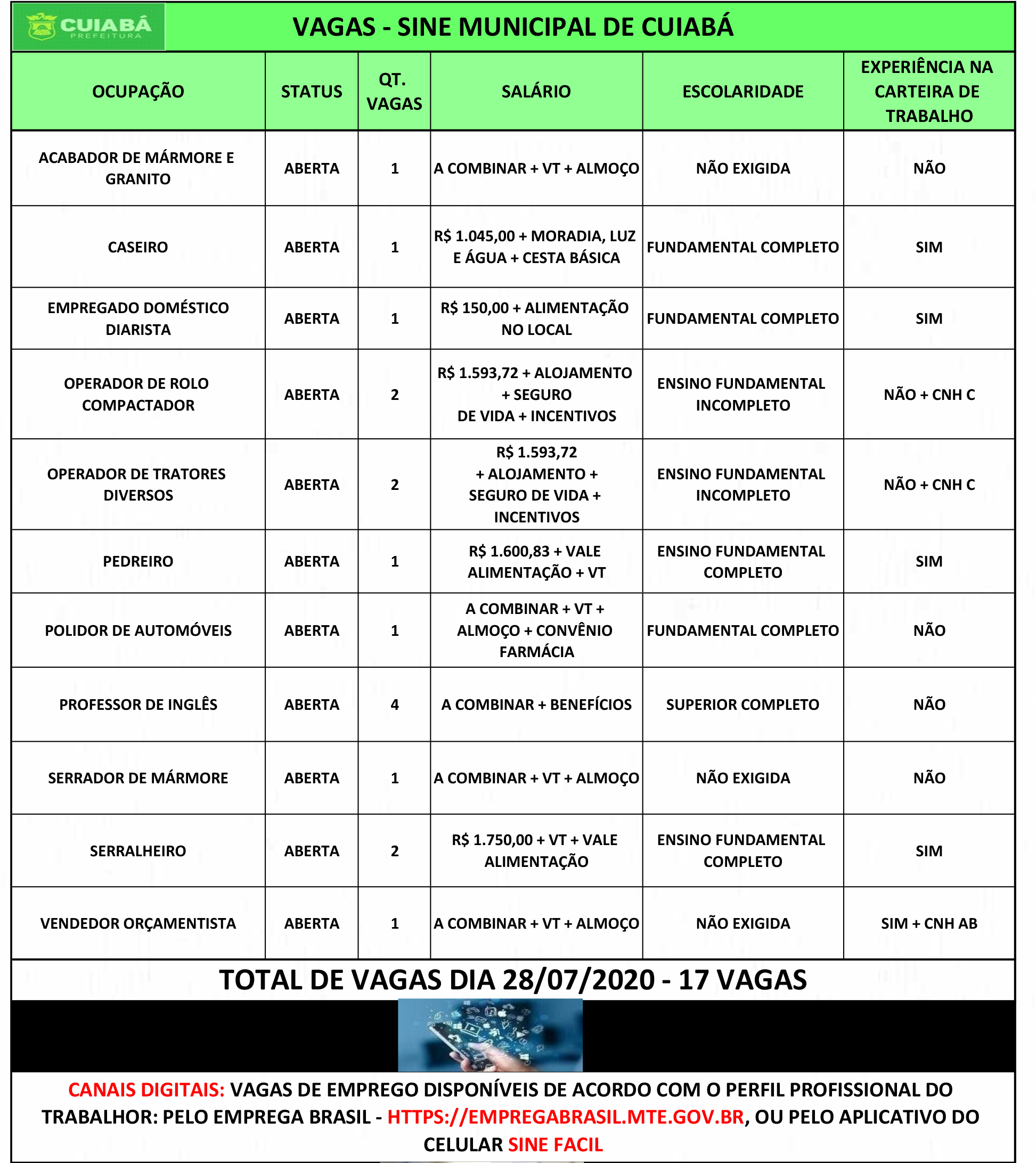 Com uma de suas sedes no Shopping Popular, o Sistema Nacional de Emprego (Sine-MT), oferece diversas vagas de emprego na semana desta terça-feira (28). Entre elas, há vagas para professor de inglês, serralheiro, pedreiro, entre outras.