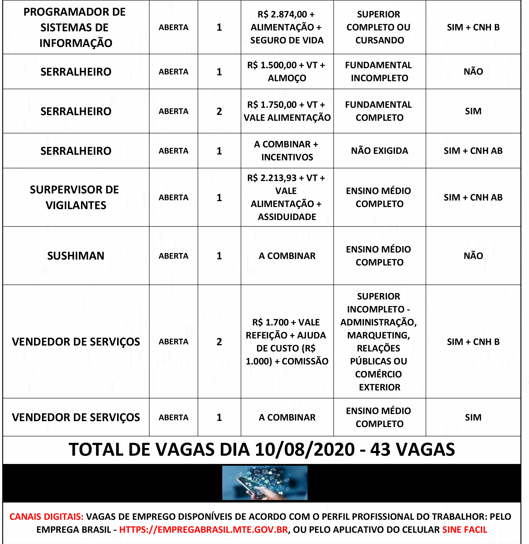Os candidatos devem ficar atentos, pois as vagas são preenchidas diariamente. E para os que já estão cadastrados no Sine, é preciso sempre atualizar o cadastro, para não perder uma oportunidade.