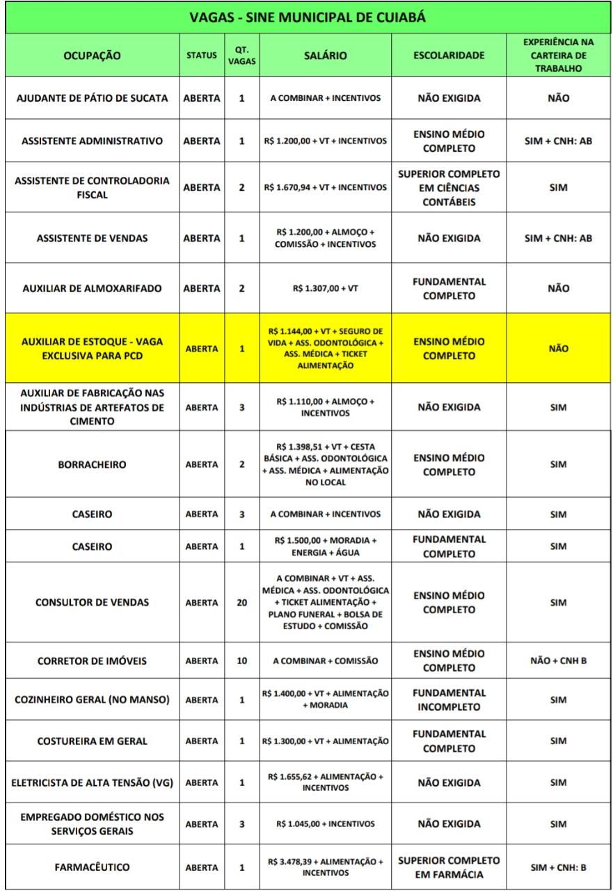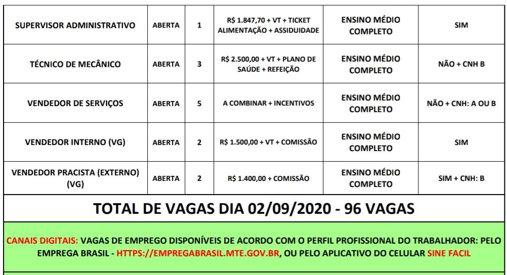 Com uma de suas sedes no Shopping Popular, o Sistema Nacional de Emprego (Sine-MT), oferece 96 vagas de emprego nesta quarta-feira (02). Entre elas, há vagas para borracheiro, caseiro, costureira, entre outras. Os candidatos devem ficar atentos, pois as vagas são preenchidas diariamente. E para os que já estão cadastrados no Sine, é preciso sempre atualizar o cadastro, para não perder uma oportunidade. O atendimento na unidade Sine Shopping Popular acontece das 9h às 17h (de segunda a sexta-feira). Os interessados devem agendar o atendimento previamente pelo telefone 3664-1503. Após isso, comparecer na unidade no dia e horário marcado, portando documentos pessoais, CTPS e comprovante de endereço atualizado. As vagas também estão disponíveis no aplicativo de celular Sine Fácil, disponível no Google Play Store ou App Store.
