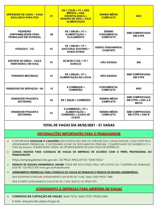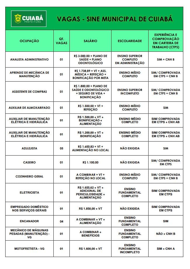 O ano já iniciou com muita vaga de emprego disponível para que você tenha mais chances de entrar no mercado de trabalho. Nesta qaurta-feira (24), o Sistema Nacional de Emprego (Sine-MT), oferece 51 vagas de emprego. Entre elas, há vagas para assistente de compra, azulejista, eletricista, encanador entre outras opções.