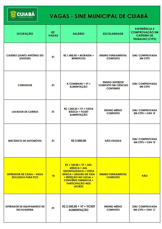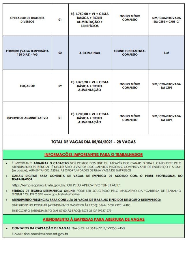 O ano já iniciou com muita vaga de emprego disponível para que você tenha mais chances de entrar no mercado de trabalho. Nesta segunda-feira (05), o Sistema Nacional de Emprego (Sine-MT), oferece 28 vagas de emprego. Entre elas, há vagas para contador,mecânico, roçador, lavador de carros entre outras opções.
