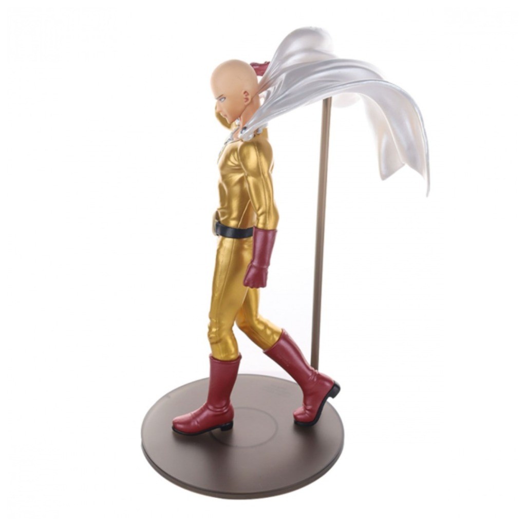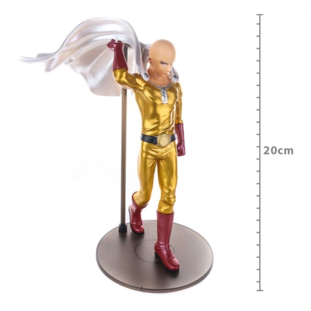Do anime One Punch Man vem uma figura de Saitama! Ele tem cerca de 20 centímetros polegadas de altura e foi fielmente recriado com um acabamento metálico em seu traje.